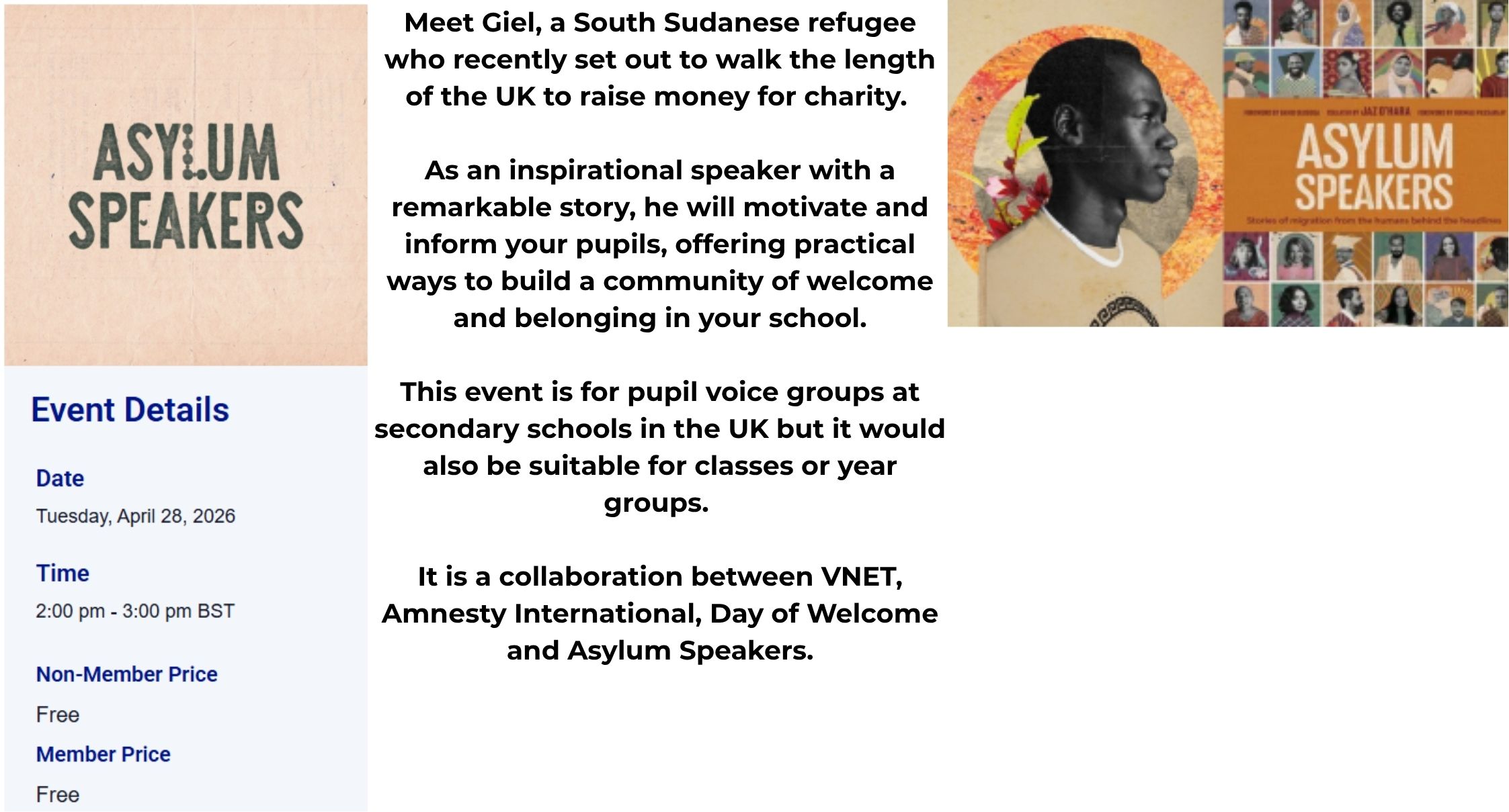 Meet Giel, a South Sudanese refugee who recently set out to walk the length of the UK to raise money for charity. As an inspirational speaker with a remarkable story, he will motivate and inform your pupils, offering practical ways to build a community of welcome and belonging in your school.