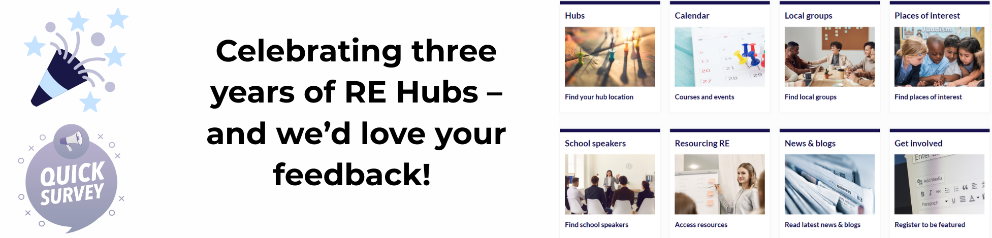 Your feedback will help shape the next phase of RE Hubs — and ensure we keep providing what you need. We have 2 surveys – one for schoolteachers and one for other stakeholders.